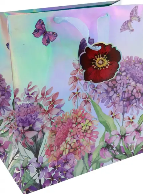 Отличительная дизайнерская особенность пакета – использование лучезарного, переливающегося на свету, голографического фона. Многообразие играющих между собой оттенков дополняется изображением различных соцветий и бабочек. Столь восхитительная тематика – приятное украшение для любого сюрприза!