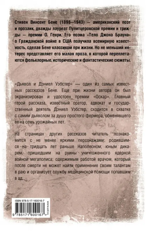 Если вы обнаружили ошибку в описании товара «Дьявол и Дэниел Уэбстер» (авторы: Бене Стивен Винсент), то выделите её мышкой и нажмите Ctrl+Enter. Спасибо, что помогаете нам стать лучше!