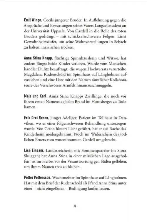 Zeitgleich beginnt das Königshaus eine unerbittliche Jagd auf alle Gegner der Regentschaft. Ein Brief mit den Namen der Verschwörer soll im Umlauf sein – und ausgerechnet die vermisste Anna Stina Knapp wurde damit gesehen. Zwei begnadete Ermittler stellen sich der Dunkelheit entgegen und wollen nicht nur Ceton fassen, sondern auch Anna Stina beschützen: Emil Winge und der einarmige Veteran Jean Michael Cardell. Doch während sie noch versuchen, für das Gute einzustehen, bahnt sich unaufhaltsam ein Inferno an …