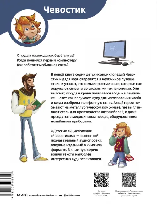В новой книге серии детских энциклопедий Чевостик и дядя Кузя отправятся в необычное путешествие и узнают, что самые простые вещи, которые нас окружают, связаны со сложными технологиями. Они выяснят, откуда в кране появляется вода, а в лампочке — свет, как получают муку для изготовления хлеба и когда изобрели телефонную связь. А ещё герои побывают на металлургическом комбинате, где выплавляют сталь для производства автомобилей, и даже проедутся в медицинском поезде, оборудованном новейшими приборами.