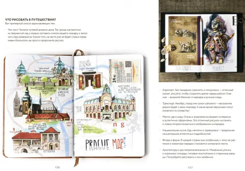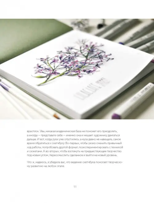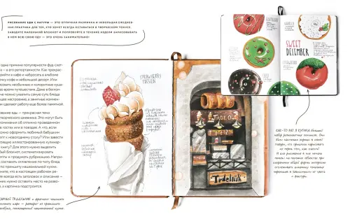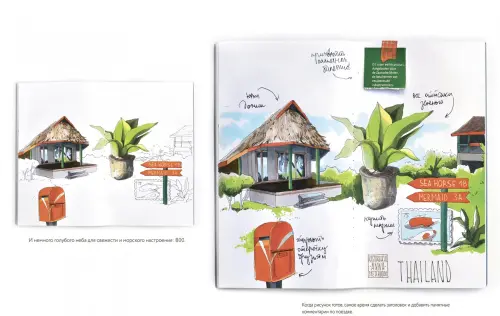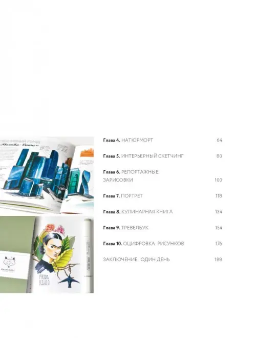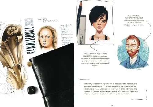 Богатая практическая часть - особенности работы с каждым жанром и пошаговое создание разворота в скетчбуке.