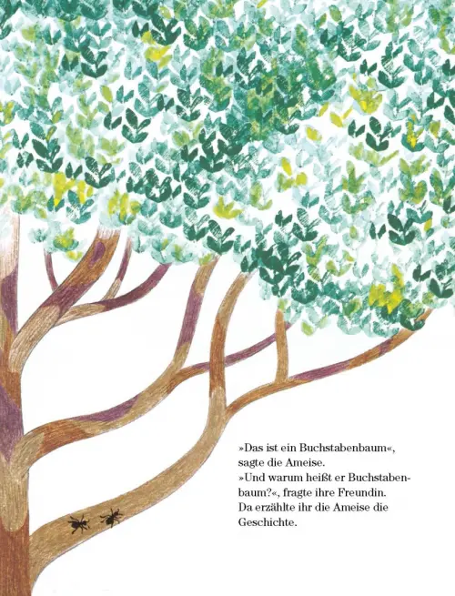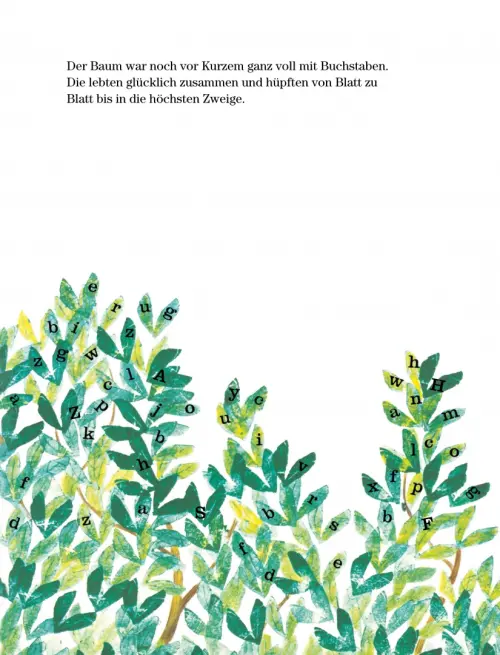 Die Wörter leben im Buchstabenbaum in ständiger Angst vor dem Sturm, der sie auseinander reißen könnte. Wie gut, dass die Raupe ihnen zeigt, wie sie Sätze bilden können: »Warum tut ihr euch nicht zusammen und seid endlich etwas von Bedeutung?«