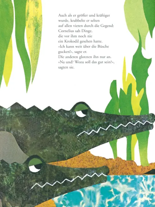 "Cornelius ist ein Krokodil. Seit er dem Ei entschlüpft ist, bevorzugt er den aufrechten Gang. Das eröffnet ihm Perspektiven, wie sie seinesgleichen bisher nicht möglich waren. Seine Artgenossen sehen das zunächst mit Befremden und Geringschätzung." Hessischer Rundfunk