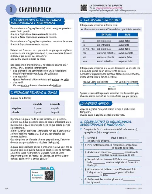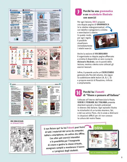 Include anche un VIDEOCORSO in 10 episodi, una GRAMMATICA, un VOCABOLARIO ILLUSTRATO, un ESERCIZIARIO e gli episodi a fumetti di "VIVERE E PENSARE ALL'ITALIANA".