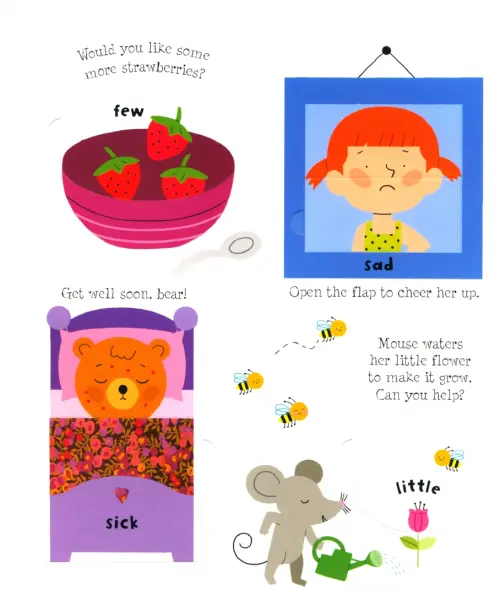 A colourful book with over 60 flaps to lift to teach little children about opposites in a fun way. Pages include colourful scenes at the park, in the ocean, in the jungle and more. Each flap has its opposite hiding behind it. Bright illustrations of large and small parrots, high and low swings at the park and hot and cold picnic foods make the opposites clear and give prereaders lots to spot and talk about. With pages for commonly used opposites such as above and below, inside and outside and big and little.