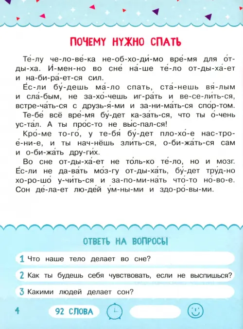 Небольшие поучительные рассказы с интересными историями и яркие иллюстрации сделают процесс обучение ребенка чтению по-настоящему увлекательным. В каждом рассказе не более 100 слов. Все слова в книгах серии "Тренажер для чтения" разбиты на слоги для более легкого освоения навыка чтения. В них также расставлены ударения в соответствии с литературной нормой.