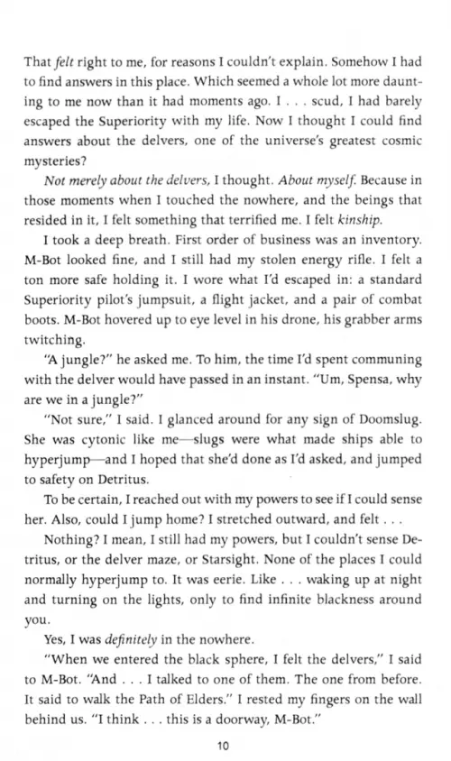 Except that Spensa is Cytonic. She faced down a Delver and saw something eerily familiar about it. And maybe, if she's able to figure out what she is, she could be more than just another pilot in this unfolding war. She could save the galaxy. The only way she can discover what she really is, though, is to leave behind all she knows and enter the Nowhere. A place from which few ever return.