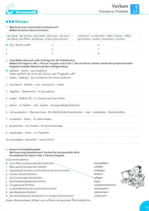 Zu jedem Grammatikthema gibt es zahlreiche Übungen in unterschiedlichsten Formen und Schwierigkeitsgraden zur Anwendung des Gelernten. Übungen mit niedrigerem Schwierigkeitsgrad dienen zur Verdeutlichung, Wiederholung und Festigung der Strukturen. Zu den Übungen mit hohem Schwierigkeitsgrad zählen vor allem Umformungen von Sätzen und Texten. Ihre Funktion ist es, den flexiblen Einsatz verschiedener grammatischer Strukturen zu trainieren, das Sprachgefühl zu sensibilisieren und stilistische Sicherheit zu vermitteln. Lerner können sich bei der Auswahl der Übungen an den eigenen Bedürfnissen und Lernzielen orientieren. Die Übungen sind in kommunikative und authentische Kontexte eingebunden. Die Themen beziehen sich auf das Alltags- und Arbeitsleben und vermitteln Wortschatz aus beiden Bereichen.