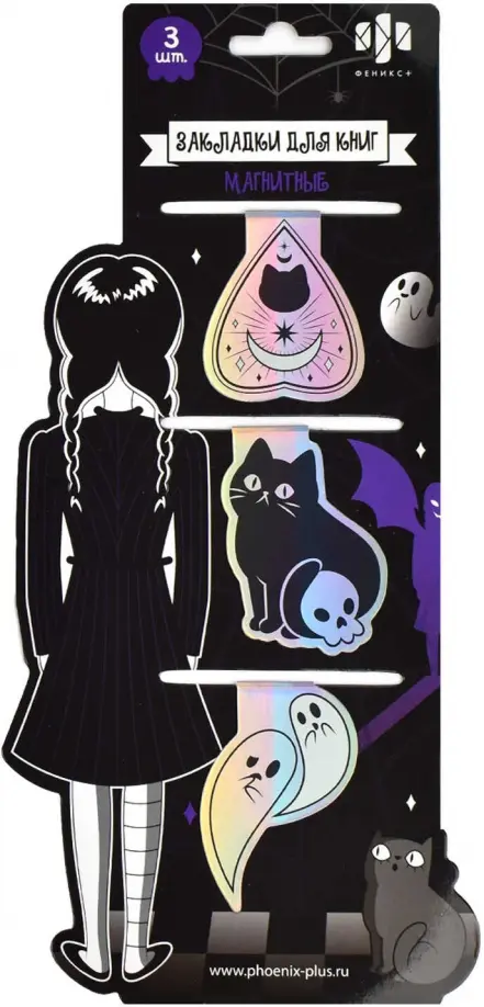 Набор закладок магнитных для книг (3 шт. в наборе, размер 40x47; 40x57; 39x56, материал: голографическая бумага, ферроагломерированный полимер; цвет: чёрный, белый, декор: фигурная вырубка, шелкография в две краски, особенности: глянцевая ламинация, индивидуальная упаковка: подложка с европодвесом из мелованного картона + ПЭТ-пакет)