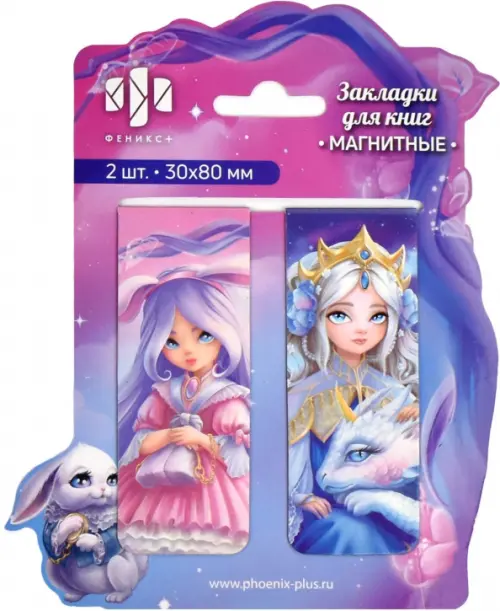 Набор закладок магнитных для книг (2 шт. в наборе, размер 30x80 мм, материал: мелованная бумага, ферроагломерированный полимер; цвет: голубой, розовый, фиолетовый, декор: полноцветный дизайн, особенности: глянцевая ламинация, индивидуальная упаковка: подложка с европодвесом из мелованного картона + ПЭТ-пакет)