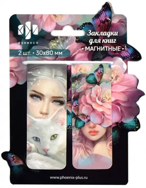 Набор закладок магнитных для книг (2 шт. в наборе, размер 30x80 мм, материал: мелованная бумага, ферроагломерированный полимер; цвет: белый, зелёный, розовый, декор: полноцветный дизайн, особенности: глянцевая ламинация, индивидуальная упаковка: подложка с европодвесом из мелованного картона + ПЭТ-пакет)