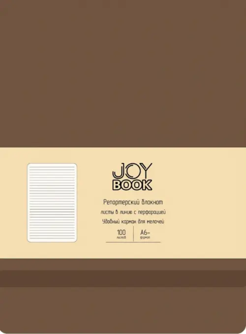 Блокнот репортерский А6- формата серии JOY BOOK от компании “Эксмо” не только красив, но и практичен. Твердая обложка из экокожи в ярком цвете снабжена фиксирующей резинкой, бумага имеет кремовый оттенок, а в конце блока спрятан кармашек для важных мелочей вроде визиток, билетов, записок. Компактный формат позволяет взять блокнот с собой даже в небольшую сумочку. Листаж 100 листаж, 7Б, в линию.