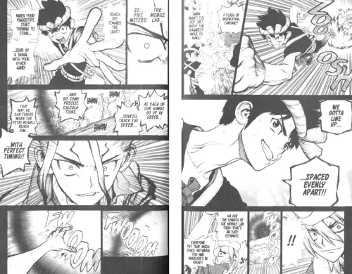 The battle between the Kingdom of Science and Petrification Kingdom is down to a mano a mano match between Senku and Ibara! With his petrified friends' spirits supporting him, can Senku finally get his hands on the all-powerful petrification weapon?! Later, a shocking revelation about the mysterious "Why-Man" leads the Kingdom of Science on a new adventure!