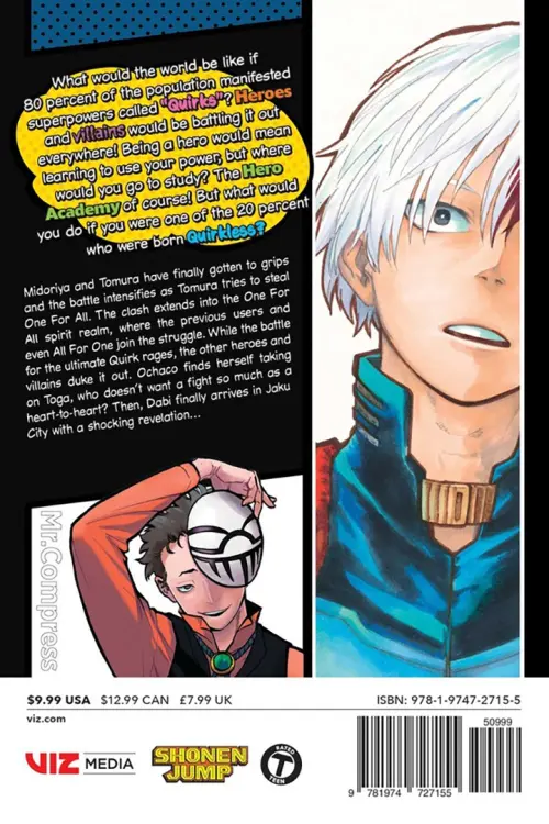 Midoriya and Tomura have finally come to blows and the battle intensifies as Tomura tries to steal One For All. The clash extends into the One For All spirit realm, where the previous users and even All For One join the struggle. While the battle for the ultimate Quirk rages, the other heroes and villains duke it out. Ochaco finds herself taking on Toga, who doesn’t want a fight so much as a heart-to-heart? Then, Dabi finally arrives in Jaku City with a shocking revelation…