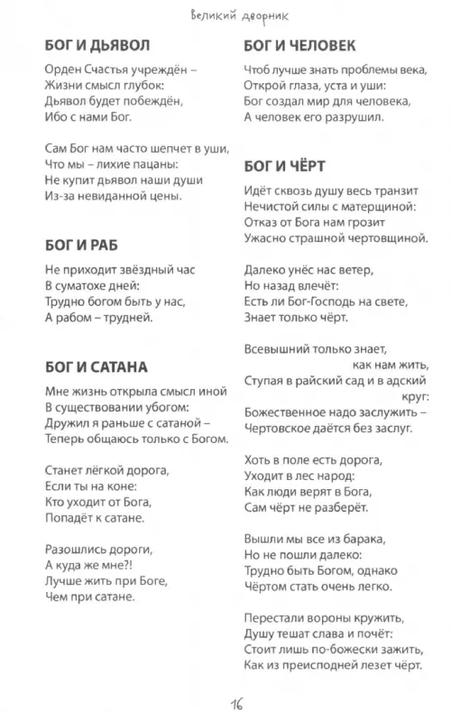 "Великий дворник" - его 57-я сатирико-юмористическая книга, продолжающая серию изданий, в каждом из которых содержится по две тысячи новых четверостиший-ЗЕВСограмм. Миниатюры поэта насыщены глубоким смыслом, яркой афористичностью и самобытным юмором.