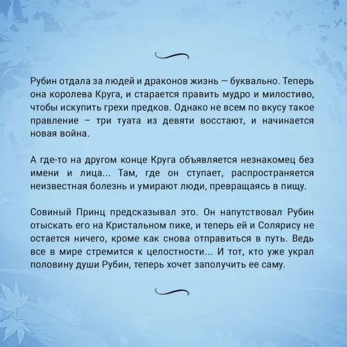 Совиный Принц предсказывал это. Он напутствовал Рубин отыскать его на Кристальном пике, и теперь ей и Солярису не остается ничего, кроме как снова отправиться в путь. Ведь все в мире стремится к целостности... И тот, кто уже украл половину души Рубин, теперь хочет заполучить ее саму.