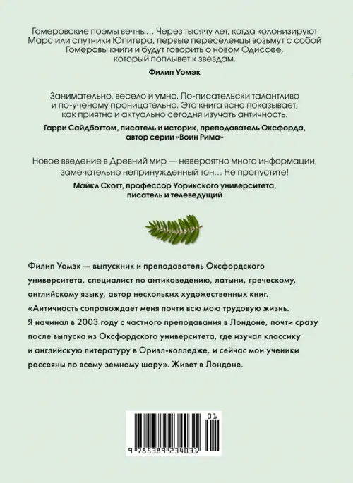 «Греческий и латынь, разумеется, никакие не мертвые. Их жизнь бурлила во все века. Представьте себе реку, у которой несколько устий, а еще вдобавок несколько притоков, и все они впадают в огромное литературно-культурное море. Тексты и мифы, которыми и занимается антиковедение, сейчас актуальны, как и всегда. Этот libellus, или эта книжечка, даст вам все, что нужно для общего представления о предмете. Мы будем обсуждать и крупные темы, и мелочи. Мы обнаружим мифологические основания для литературы и философии, посмотрим, как возникли великие эпические поэмы, с которых началась западная цивилизация, и какой они несут смысл. Мы исследуем, как работает история, поговорим о любовной поэзии и трагедиях... На страницах этой книги мы с Уной бродим по грязным и многолюдным улицам на севере Лондона и почти сельским холмам Хэмпстед-хит, но в воображении мы проходим мимо афинского Парфенона во всей его расцвеченной красе, подглядываем за римскими сенаторами, пока Цицерон уличает негодяя Катилину, или просто праздно играем во дворе в кости. Чтобы составить нам компанию в этом путешествии, вам не понадобятся даже ботинки… А теперь приготовились — и берите от этой книги всё!» (Филип Уомэк)