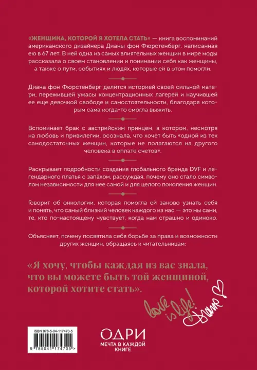 Красота в деталях: топ-7 книг о стиле и модеЕсли вы обнаружили ошибку в описании товара «Женщина, которой я хотела стать. Мемуары» (авторы: Фюрстенберг Диана фон), то выделите её мышкой и нажмите Ctrl+Enter. Спасибо, что помогаете нам стать лучше!