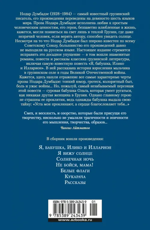 Нодар Думбадзе (1928–1984) — самый известный грузинский писатель, его произведения переведены на девяносто шесть языков мира. Проза Нодара Думбадзе исполнена любви к простым человеческим ценностям, его герои, беззаветно влюбленные в жизнь, кажется, могли появиться на свет лишь в теплой Грузии, где даже незрячий человек, если верить автору, способен увидеть солнце. Несмотря на то что Нодар Думбадзе был широко известен по всему Советскому Союзу, большинство его произведений давно не выходили на русском языке. Настоящее издание стремится исправить это досадное упущение — в том вошли знаменитые романы, повести и рассказы классика грузинской литературы, включая самую известную повесть «Я, бабушка, Илико и Илларион». В ней рассказана история взросления мальчика в грузинском селе в годы Великой Отечественной войны. Кажется, здесь нашли отражение все самые характерные черты прозы Нодара Думбадзе: тонкий юмор, гротеск, колоритный быт, боль и ужас войны… Но, пожалуй, самый незабываемый персонаж этой повести — суровая бабушка Ольга, которая умеет ругаться, как никакая другая женщина в Грузии. Однако главному герою не страшны ее проклятия, ведь однажды бабушка выдала свою тайну: «уста мои проклинают, а сердце благословляет тебя…»