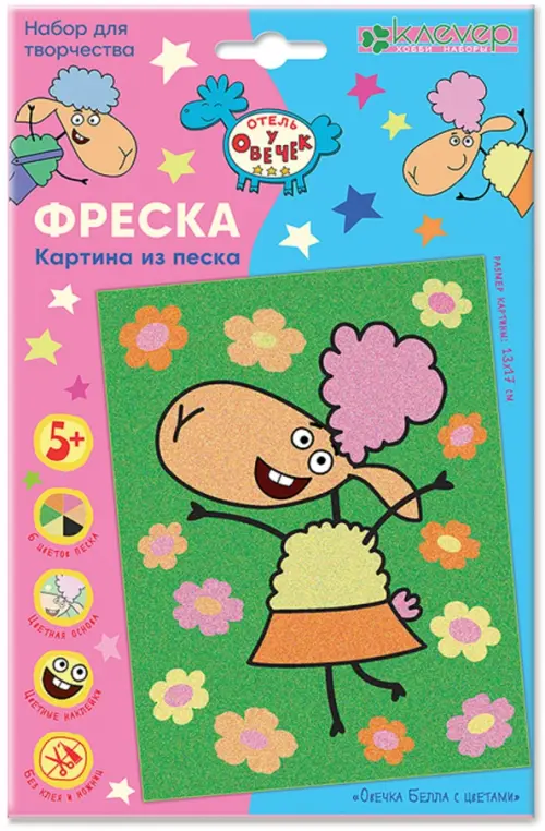 Рисование песком — популярный вид творчества у детей старше 5 лет. Создавая песочную картину с овечкой Беллой среди цветов из мультфильма «Отель у овечек», ребёнок почувствует себя настоящим художником. Творчество с песком помогает развивать воображение ребёнка, внимательность, аккуратность, мелкую моторику его пальчиков, через моторику — речь, память и координацию. Занятие с песком гармонизирует эмоции ребёнка и раскрывает широту творческого восприятия мира. Картина из песка выглядит очень декоративно!