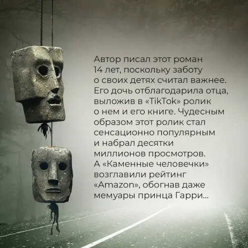 Автор писал этот роман 14 лет, поскольку заботу о своих детях считал важнее. Его дочь отблагодарила отца, выложив в «TikTok» ролик о нем и его книге. Чудесным образом этот ролик стал сенсационно популярным и набрал десятки миллионов просмотров. А «Каменные человечки» возглавили рейтинг «Amazon», обогнав даже мемуары принца Гарри…