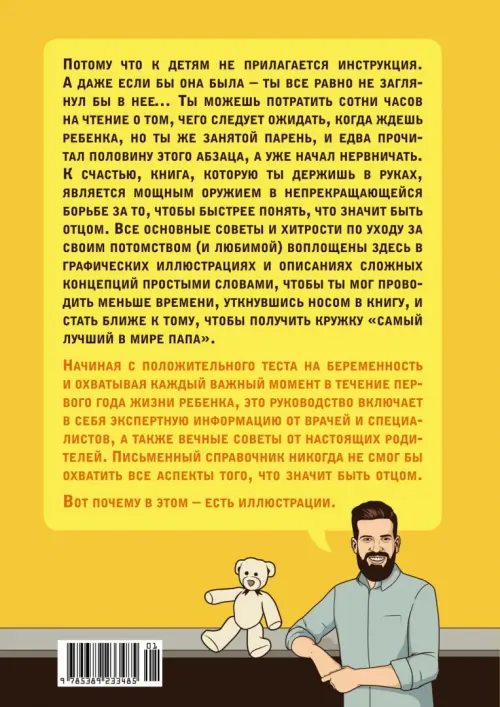 Ты можешь потратить сотни часов на чтение о том, чего следует ожидать, когда ждешь ребенка, но ты же занятой парень, и едва прочитал половину этого абзаца, а уже начал нервничать. К счастью, книга, которую ты держишь в руках, является мощным оружием в непрекращающейся борьбе за то, чтобы быстрее понять, что значит быть отцом. Все основные советы и хитрости по уходу за своим потомством (и любимой) воплощены здесь в графических иллюстрациях и описаниях сложных концепций простыми словами, чтобы ты мог проводить меньше времени, уткнувшись носом в книгу, и стать ближе к тому, чтобы получить кружку «самый лучший в мире папа». Начиная с положительного теста на беременность и охватывая каждый важный момент в течение первого года жизни ребенка, это руководство включает в себя экспертную информацию от врачей и специалистов, а также вечные советы от настоящих родителей. Письменный справочник никогда не смог бы охватить все аспекты того, что значит быть отцом. Вот почему в этом – есть иллюстрации.