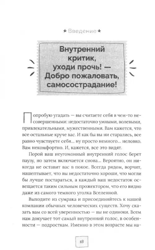 Книга поможет вам держать внутреннего критика под контролем и открыть пространство для другого внутреннего голоса — гораздо более сострадательного и доброго. Сострадание к себе — качество, которое помогает лучше осознавать свои эмоции, ценить собственные сильные качества и справляться с тяжелыми чувствами. Вы поймете, что умение быть себе другом гораздо лучше помогает достигать своих целей, чем постоянная тревога и самокритика. И чем мягче мы относимся к себе, тем легче нам быть добрее к другим людям. А значит — заводить новых друзей, находить единомышленников и с успехом справляться с повседневными задачами.