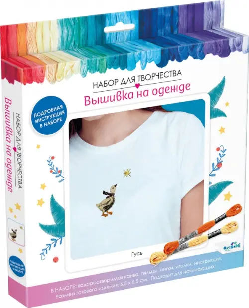 Набор для творчества. Вышивка на одежде — «Гусь» это готовый комплект для создания уникальных дизайнов на одежде. В набор входят пяльцы, водорастворимая канва с нанесенным контуром рисунка, нитки мулине, иголка, инструкция по созданию дизайнов. Вышивка гладью - это техника, при которой нитки проходят сквозь ткань и создают рисунок, который можно использовать для украшения одежды, сумок, шарфов и других аксессуаров. Набор для творчества подходит как для начинающих, так и для опытных мастеров, которые хотят создать оригинальные и уникальные вещи. В процессе вышивания вы получите не только красивые вещи, но и удовольствие от процесса творчества.