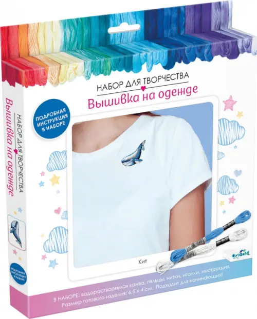 Набор для творчества. Вышивка на одежде — «Кит» это готовый комплект для создания уникальных дизайнов на одежде. В набор входят пяльцы, водорастворимая канва с нанесенным контуром рисунка, нитки мулине, иголка, инструкция по созданию дизайнов. Вышивка гладью - это техника, при которой нитки проходят сквозь ткань и создают рисунок, который можно использовать для украшения одежды, сумок, шарфов и других аксессуаров. Набор для творчества подходит как для начинающих, так и для опытных мастеров, которые хотят создать оригинальные и уникальные вещи. В процессе вышивания вы получите не только красивые вещи, но и удовольствие от процесса творчества.