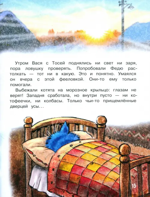 Когда наступают морозы… самое время ловить котофеечек! Что и затевает наша дружная троица однажды вечером. Котофеечки такие загадочные и такие неуловимые. А как красиво светятся в темноте! Для Феди, Васи и Тоси, если уж они что-то задумали, невозможного нет: и ловушку мастерили, и колбасой жертвовали… Но котофеечки так легко не сдаются! Вот котята и оказались в дремучем лесу на ночь глядя… Не волнуйтесь! Конечно же всё закончилось хорошо и по-котофеевски, с застольем! Но как котята в метель выбрались из леса и удалось ли им приручить котофеечек, вы узнаете, прочитав эту историю.