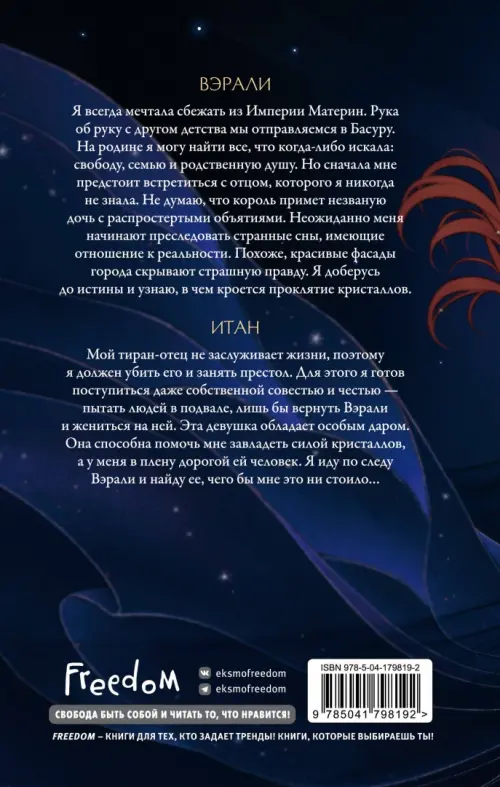 Я всегда мечтала сбежать из Империи Материн. Рука об руку с другом детства мы отправляемся в Басуру. На родине я могу найти все, что когда-либо искала: свободу, семью и родственную душу. Но сначала мне предстоит встретиться с отцом, которого я никогда не знала. Не думаю, что король примет незваную дочь с распростертыми объятиями. Неожиданно меня начинают преследовать странные сны, имеющие отношение к реальности. Похоже, красивые фасады города скрывают страшную правду. Я доберусь до истины и узнаю, в чем кроется проклятие кристаллов.