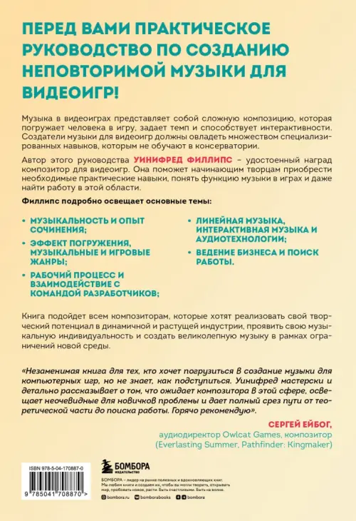 «Незаменимая книга для тех, кто хочет погрузиться в создание музыки для компьютерных игр, но не знает, как подступиться. Уинифред мастерски и детально рассказывает о том, что ожидает композитора в этой сфере, освещает неочевидные для новичков проблемы и дает полный срез пути от теоретической части до поиска работы. Горячо рекомендую». — Сергей Ейбог, аудиодиректор Owlcat Games, композитор (Everlasting Summer, Pathfinder: Kingmaker)