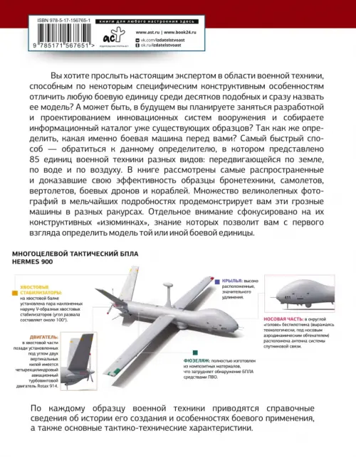 Вы хотите прослыть настоящим экспертом в области военной техники, способным по некоторым специфическим конструктивным особенностям отличить любую боевую единицу среди десятков подобных и сразу назвать ее модель? А может быть, в будущем вы планируете заняться разработкой и проектированием инновационных систем вооружения и собираете информационный каталог уже существующих образцов? Так как же определить, какая именно боевая машина перед вами? Самый быстрый способ - обратиться к данному определителю, в котором представлено 85 единиц военной техники разных видов: передвигающейся по земле, по воде и по воздуху. В книге представлены самые распространенные и доказавшие свою эффективность образцы бронетехники, самолетов, вертолетов, боевых дронов и кораблей. Множество великолепных фотографий в мельчайших подробностях продемонстрирует вам эти грозные машины в разных ракурсах. Отдельное внимание сфокусировано на их конструктивных "изюминках", знание которых позволит вам с первого взгляда определить модель той или иной боевой единицы.