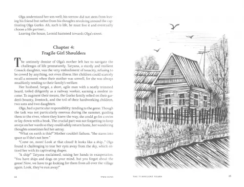 As readers immerse themselves in this compelling narrative, they will traverse different times and places: soaring through the skies and grounding themselves on the sunlit terrain of the Poltava Region; exploring the bustling streets of Henichesk; wandering through the cultural hubs of Kiev and Kharkov; meandering amidst the grandeur of Moscow and Leningrad; venturing into Yaroslavl and Gorky; embarking on captivating journeys across the vast expanses of Siberia and Central Asia. Along the way, they will gain insight into the intricacies of life in a communal Moscow apartment, experience the charm and simplicity of a Ukrainian village, and even accompany an exploration and survey party on their mission. Throughout the course of their lives, the heroes of this tale encounter numerous individuals, spanning the spectrum from “red” to “white,” and even those who remain neutral. Each interaction leaves an indelible mark on the very fabric of their souls. It is imperative to note that this book draws its inspiration from actual historical events, and its characters are firmly rooted in the annals of history.