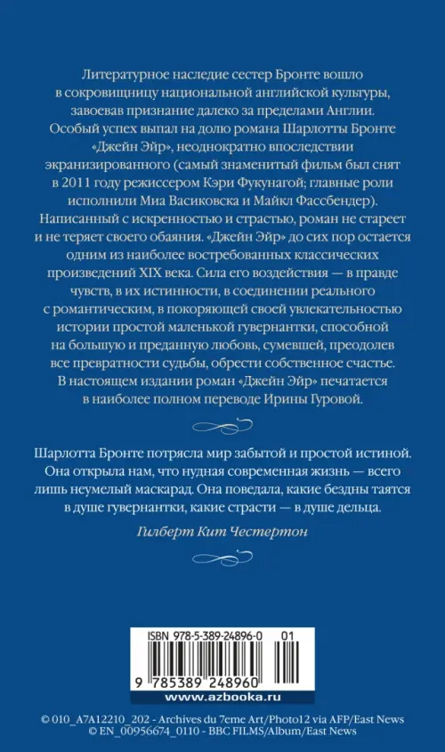 Литературное наследие сестер Бронте вошло в сокровищницу национальной английской культуры, завоевав признание далеко за пределами Англии. Особый успех выпал на долю романа Шарлотты Бронте "Джейн Эйр", неоднократно впоследствии экранизированного (самый знаменитый фильм был снят в 2011 году режиссером Кэри Фукунагой; главные роли исполнили Миа Васиковска и Майкл Фассбендер). Написанный с искренностью и страстью, роман не стареет и не теряет своего обаяния. "Джейн Эйр" до сих пор остается одним из наиболее востребованных классических произведений XIX века. Сила его воздействия - в правде чувств, в их истинности, в соединении реального с романтическим, в покоряющей своей увлекательностью истории простой маленькой гувернантки, способной на большую и преданную любовь, сумевшей, преодолев все превратности судьбы, обрести собственное счастье. В настоящем издании роман "Джейн Эйр" печатается в наиболее полном переводе Ирины Гуровой.