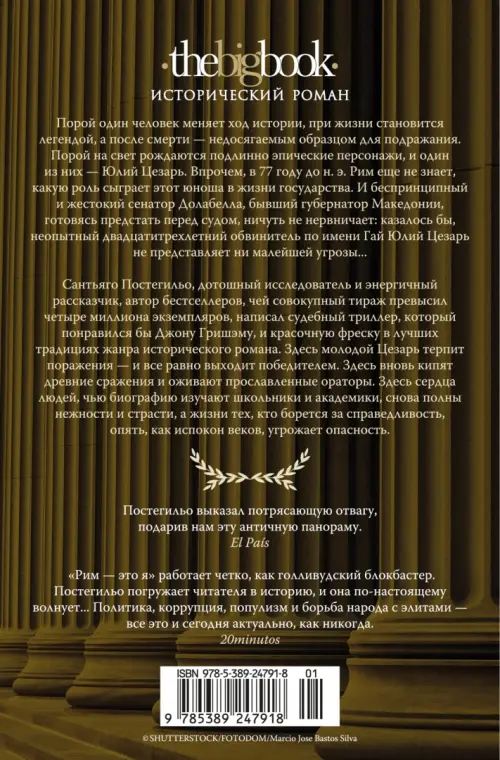 Порой один человек меняет ход истории, при жизни становится легендой, а после смерти - недосягаемым образцом для подражания. Порой на свете рождаются подлинно эпические персонажи, и один из них - Юлий Цезарь, фигура многогранная и сложная, защитник народа и борец с элитами, который превратился в диктатора и за свое стремление к власти поплатился жизнью. Впрочем, в 77 году до н. э. Рим еще не знает, до чего важен окажется этот юноша для государства. И беспринципный и жестокий сенатор Долабелла, бывший губернатор Македонии, готовясь предстать перед судом, ничуть не нервничает: казалось бы, неопытный двадцатитрехлетний обвинитель по имени Гай Юлий Цезарь не представляет ни малейшей угрозы... Сантьяго Постегильо, филолог и лингвист, дотошный исследователь и энергичный рассказчик, автор исторических бестселлеров, посвященных истории Древнего Рима, всю жизнь готовился написать цикл о Юлии Цезаре. "Мне казалось, право писать о нем я должен заслужить", - говорит он. "Рим - это я", судебный триллер, который понравился бы Джону Гришэму, и красочная фреска в лучших традициях жанра исторического романа, - первая книга цикла, и в ней речь идет о малоизвестном эпизоде биографии Цезаря. Здесь Цезарь, еще молодой человек, терпит поражения - и все равно выходит победителем, впервые добиваясь признания масс. Здесь вновь кипят сражения, выигранные две тысячи лет назад, и оживают ораторы, соревнующиеся в красноречии, на котором мы учимся по сей день. Здесь сердца людей, чью биографию изучают школьники и академики, снова полны нежности и страсти, а жизни тех, кто борется за справедливость, опять, как испокон веков, угрожает опасность. Впервые на русском!