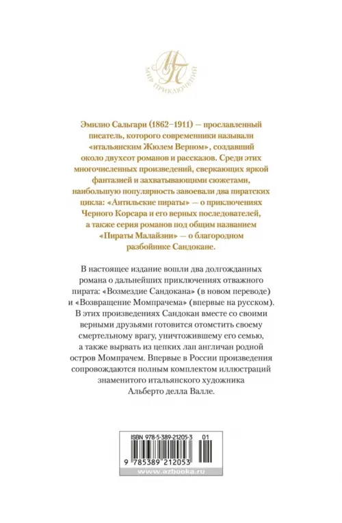 Эмилио Сальгари (1862-1911) - прославленный писатель, которого современники называли "итальянским Жюлем Верном", создавший около двухсот романов и рассказов. Среди этих многочисленных произведений, сверкающих яркой фантазией и захватывающими сюжетами, наибольшую популярность завоевали два пиратских цикла: "Антильские пираты", о приключениях Черного Корсара и его верных последователей, а также серия романов под общим названием "Пираты Малайзии", о благородном разбойнике Сандокане. В настоящее издание вошли два долгожданных романа о дальнейших приключениях отважного пирата: "Возмездие Сандокана" (в новом переводе) и "Возвращение Момпрачема" (впервые на русском). В этих произведениях Сандокан вместе со своими верными друзьями готовится отомстить своему смертельному врагу, уничтожившему его семью, а также вырвать из цепких лап англичан родной остров Момпрачем. Впервые в России произведения сопровождаются полным комплектом иллюстраций знаменитого итальянского художника Альберто делла Валле.