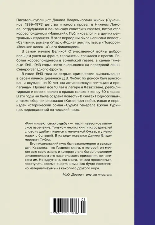 В книге собраны поразительные документы - юношеские дневники, описывающие события 1915-1917 гг. в Пензе сам факт сохранности которых удивителен и дневники фронтовые, чудом уцелевшие, а еще воспоминания о тяжелейшем испытании, которое пришлось на долю искреннего, честного, принципиального и очень красивого человека - отбывании десятилетнего срока в ГУЛАГе. Талантливый писатель Даниил Фибих создал уникальную картину эпохи глазами очевидца, которому было суждено жить в самые сложные, переломные и трагические годы истории нашей страны. С воодушевлением принявший революцию, работавший корреспондентом "Известий", автор рассказов, очерков и повестей, он добровольцем ушел на фронт, где был корреспондентом на передовой линии Западного и Северо-Западного фронта. В июне 1943 году был арестован по доносу сослуживца и осужден на срок 10 лет, который полностью отбыл. Не сломался, добился реабилитации и до конца жизни продолжал трудиться. С гимназических лет он мечтал не просто стать писателем, а создать нечто такое, что осталось бы после него. "Хочется написать такую книгу, которая бы пережила меня, явилась бы итогом целой жизни". Эта книга перед вами.