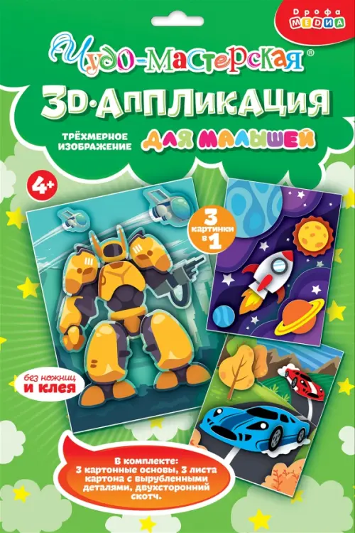 Классный набор 3D-аппликаций от российского издательства "Дрофа Медиа" понравится юным любителям техники. Автогонки, космос и трансформеры. Аппликации яркие, очень интересно с ними работать. Материалы хорошего качества. Полезны эти творческие занятия для развития мелкой моторики, наблюдательности и воображения. Цена приемлемая. Достойный ...