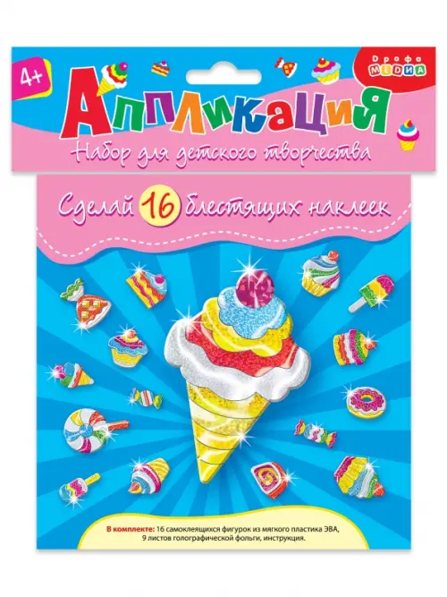 В комплекте: 16 мягких объёмных фигурок на самоклеящейся основе, 9 листов голографической фольги, инструкция.