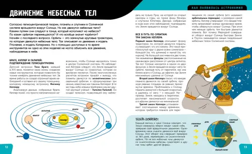 Эта космическая энциклопедия отличается прекрасным взвешенным изложением научных фактов и даёт полноценное представление о причинах, структуре, процессах, не перегружая юного читателя. Разнообразная подача информации не даст заскучать: в книге множество увлекательных схем, ленты времени, макеты Солнечной системы и космических кораблей, карты небесных тел, а также словарь полезных слов.
