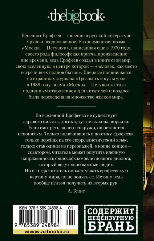 Если вы обнаружили ошибку в описании товара «Москва – Петушки» (авторы: Ерофеев Венедикт Васильевич), то выделите её мышкой и нажмите Ctrl+Enter. Спасибо, что помогаете нам стать лучше!
