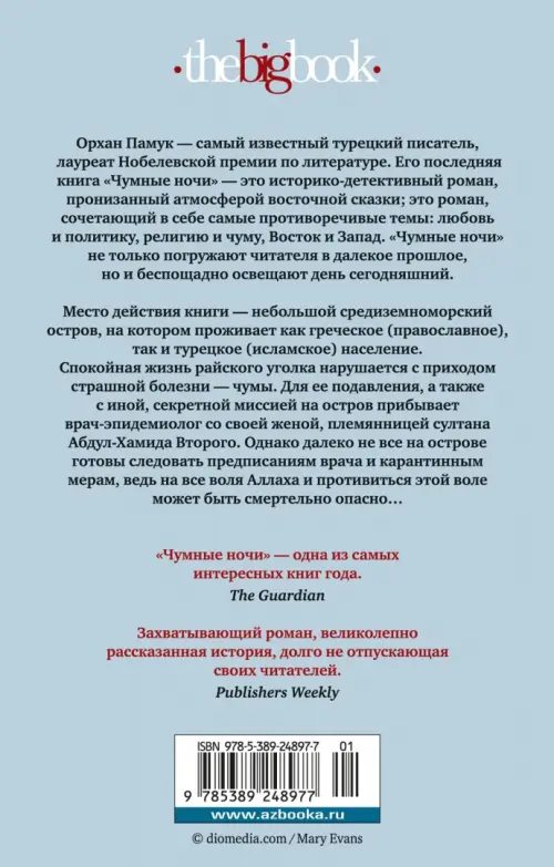 Орхан Памук - самый известный турецкий писатель, лауреат Нобелевской премии по литературе. Его последняя книга "Чумные ночи" - это историко-детективный роман, пронизанный атмосферой восточной сказки; это роман, сочетающий в себе самые противоречивые темы: любовь и политику, религию и чуму, Восток и Запад. "Чумные ночи" не только погружают читателя в далекое прошлое, но и беспощадно освещают день сегодняшний. Место действия книги - небольшой средиземноморский остров, на котором проживает как греческое (православное), так и турецкое (исламское) население. Спокойная жизнь райского уголка нарушается с приходом страшной болезни - чумы. Для ее подавления, а также с иной, секретной миссией на остров прибывает врач-эпидемиолог со своей женой, племянницей султана Абдул-Хамида Второго. Однако далеко не все на острове готовы следовать предписаниям врача и карантинным мерам, ведь на все воля Аллаха и противиться этой воле может быть смертельно опасно…