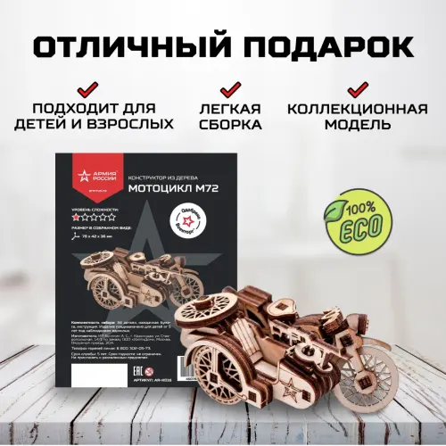 Эта сборная модель из дерева хорошо сочетается с любым интерьером и может стать интересным элементом украшения офиса или дома, а также частью коллекции Армии России. Сборная модель мотоцикла будет прекрасным подарком для тех, кто интересуется историей, техникой или просто ищет новый и интересный способ отдохнуть.