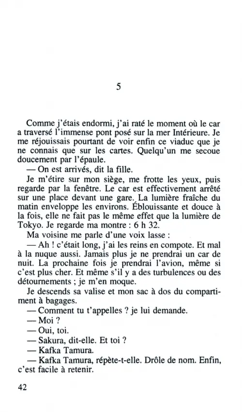 Un adolescent, Kafka Tamura, quitte la maison familiale de Tokyo pour échapper à une malédiction œdipienne proférée par son père. De l'autre côté de l'archipel, Nakata, un vieil homme amnésique, décide lui aussi de prendre la route. Leurs deux destinées s'entremêlent pour devenir le miroir l'une de l'autre, tandis que, sur leur chemin, la réalité bruisse d'un murmure envoûtant.