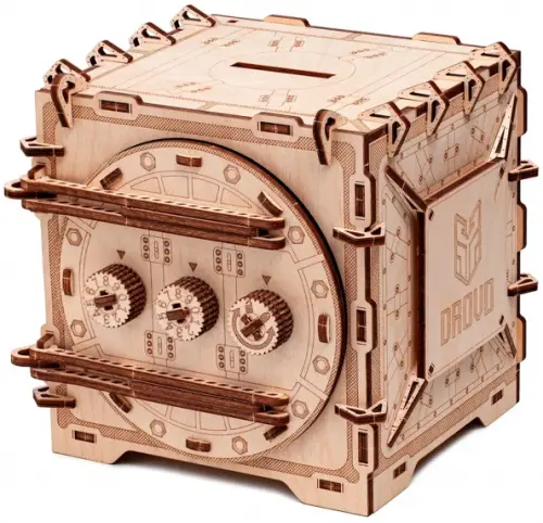 Сборная модель из дерева представляет собой полноценный сейф с механическим кодовым замком, в котором ребенок может откладывать карманные деньги, подросток хранить секреты, а взрослый спрятать дополнительный подарок в сейфе – получатель будет в восторге от сюрприза!