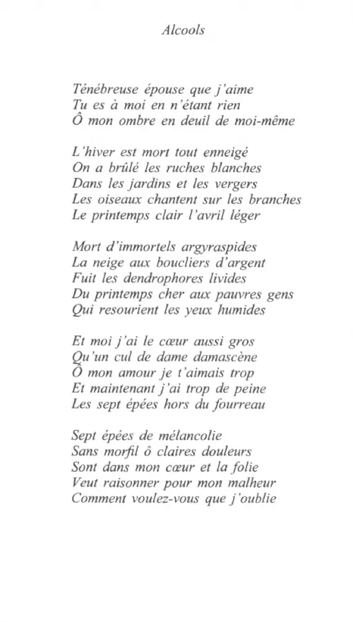 Pour Guillaume Apollinaire, la poésie se trouve en toute chose, dans les légendes comme dans les souvenirs mythologiques, dans les bruits de la rue et sur les murs de la ville, dans la vie sous toutes ses formes, dans le temps qui s’enfuit et la Seine qui coule sous le pont Mirabeau.