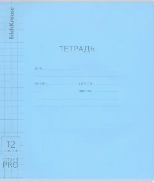 Тетрадь школьная ученическая формата А5+ (170x203 мм). Двойная обложка: внешняя выполнена из высококачественного износостойкого прозрачного пластика с фактурой «апельсиновая корка», внутренняя — из качественной мелованной бумаги. В блоке 12 листов в крупную клетку. Бумага офсетная плотностью 60 г/м2. Цвет линовки — синий. Скругленные уголки обложки и блока. Тип скрепления — скоба.
