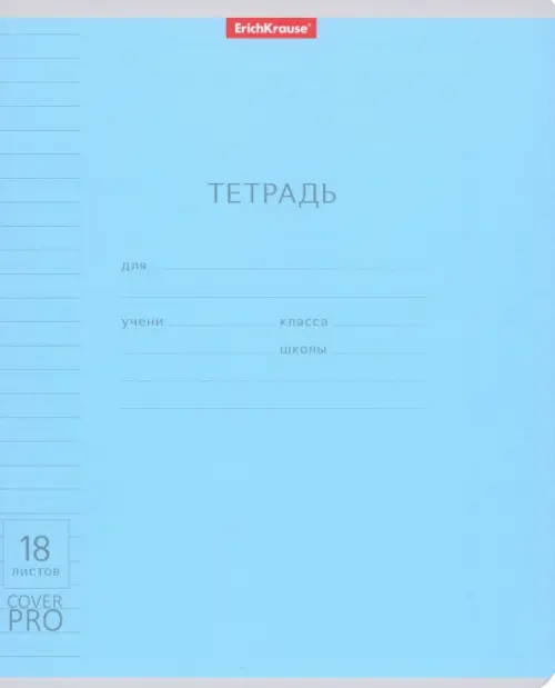 Тетрадь школьная ученическая формата А5+ (170x203 мм). Двойная обложка: внешняя выполнена из высококачественного износостойкого прозрачного пластика с фактурой «апельсиновая корка», внутренняя — из качественной мелованной бумаги. В блоке 18 листов в линейку. Бумага офсетная плотностью 60 г/м2. Цвет линовки — синий. Скругленные уголки обложки и блока. Тип скрепления — скоба. Тетради разных дизайнов упакованы в термоусадочную пленку по 10 штук.