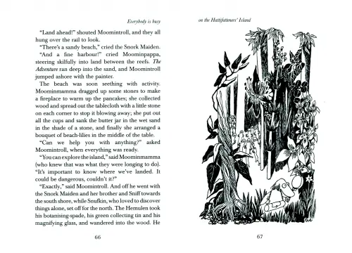 The Moomins, in case you haven’t already met them, are kind, philosophical creatures with velvety fur and smooth round snouts, who live in a beautiful valley in a forest in Finland. They have the most natural way of turning friends into family – Moominmamma simply adds another plank to the table and builds a new bed. Moomins sleep through the winter, when the snow turns their house into a great snowball. But, when spring comes, they wake and clamber down rope ladders hanging from their windows, ready for a bright new adventure.